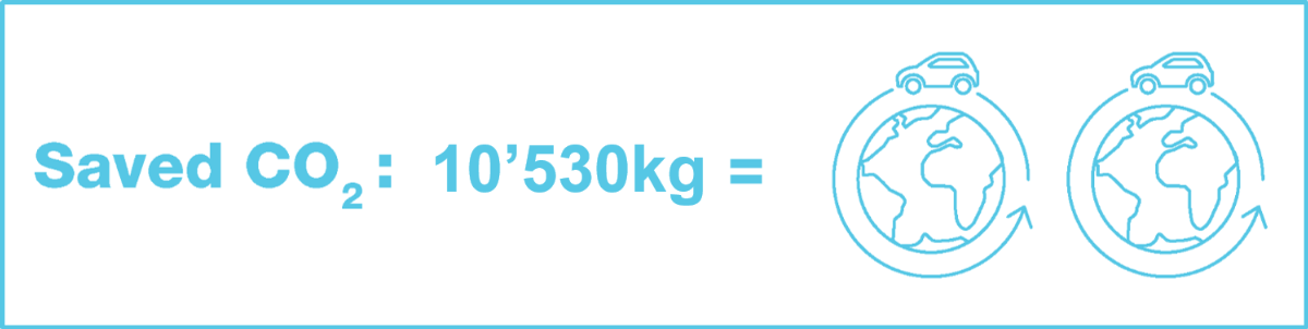 To help grasp how much 10’530 kg of CO2 are: it is equivalent to the emissions of one car driving 72’000 km, almost twice around the globe.